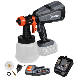 מרסס צבע נטען 18V כולל סוללה 2.5Ah ומטען 3A של Hunter. כלי קומפקטי וחזק, אידאלי לבעלי מקצוע, DIY, אומנים וחובבים. מתאים לצביעות שונות ומגוונות כמו: גדרות, פרגולות, סוכות, גזעי עץ וכד'. קל משקל ואלחוטי, ללא התעסקות בכבלים, וללא צורך לשטוף מברשות.  המרסס בעל דיזה בגודל ø1|1.5|1.8|mm וכולל כפתור ייעודי לשליטה בזרימת האוויר. אלה מתחברים למיכל בנפח 1000ml אשר מספק זמן עבודה רציף ואורך. ידית הכלי מעוצבת בצורה ארגונומית ומקנה אחיזה נוחה ועבודה רציפה לאורך זמן ללא מאמץ. קל לניקוי – לחיצה פשוטה על לחצן הפיה בראש הכלי מאפשרת פירוק קל של מיכל הצבע והפיה מתפרקים לניקוי בקלות. המרסס מציג 3 מצבי ריסוס: אופקי, אנכי ועגול, וכולל שתי דיזות מתכווננת לעוצמת אויר וכמות צבע. הכלי מגיע בעיצוב מושלם לחווית המשתמש – ניתן לשלוט בתפוקת הצבע על ידי התאמת כפתור בקרת הזרימה במרסס.  בורר הרוחב על גבי המרסס מאפשר בקרה נוחה של מיקוד המרסס על גבי המשטח, ומאפשר מעבר קל והדרגתי בין ריסוס נקודתי לריסוס רחב יותר. המרסס כולל 2 דיזות מתכתיות המאפשרת ריסוס מרוכז ואחיד לעומת דיזה פלסטית שנסתמת בקלות ופחות עמידה ללחץ. המרסס תואם לכל ליין סוללות הנטענים 18V של Hunter.