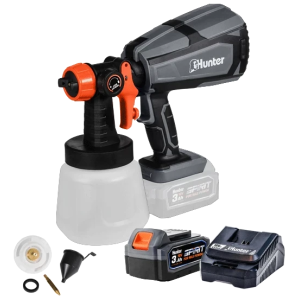 מרסס צבע נטען 18V כולל סוללה 3Ah ומטען 3A של Hunter. כלי קומפקטי וחזק, אידאלי לבעלי מקצוע, DIY, אומנים וחובבים. מתאים לצביעות שונות ומגוונות כמו: גדרות, פרגולות, סוכות, גזעי עץ וכד'. קל משקל ואלחוטי, ללא התעסקות בכבלים, וללא צורך לשטוף מברשות.  המרסס בעל דיזה בגודל ø1|1.5|1.8|mm וכולל כפתור ייעודי לשליטה בזרימת האוויר. אלה מתחברים למיכל בנפח 1000ml אשר מספק זמן עבודה רציף ואורך. ידית הכלי מעוצבת בצורה ארגונומית ומקנה אחיזה נוחה ועבודה רציפה לאורך זמן ללא מאמץ. קל לניקוי – לחיצה פשוטה על לחצן הפיה בראש הכלי מאפשרת פירוק קל של מיכל הצבע והפיה מתפרקים לניקוי בקלות. המרסס מציג 3 מצבי ריסוס: אופקי, אנכי ועגול, וכולל שתי דיזות מתכווננת לעוצמת אויר וכמות צבע. הכלי מגיע בעיצוב מושלם לחווית המשתמש – ניתן לשלוט בתפוקת הצבע על ידי התאמת כפתור בקרת הזרימה במרסס.  בורר הרוחב על גבי המרסס מאפשר בקרה נוחה של מיקוד המרסס על גבי המשטח, ומאפשר מעבר קל והדרגתי בין ריסוס נקודתי לריסוס רחב יותר. המרסס כולל 2 דיזות מתכתיות המאפשרת ריסוס מרוכז ואחיד לעומת דיזה פלסטית שנסתמת בקלות ופחות עמידה ללחץ. המרסס תואם לכל ליין סוללות הנטענים 18V של Hunter.