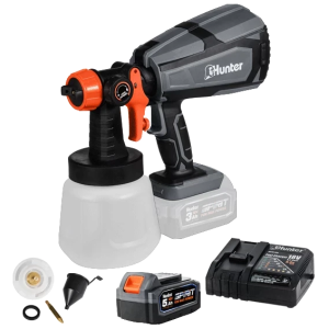 מרסס צבע נטען 18V כולל סוללה 5Ah ומטען מהיר 6.5A של Hunter. כלי קומפקטי וחזק, אידאלי לבעלי מקצוע, DIY, אומנים וחובבים. מתאים לצביעות שונות ומגוונות כמו: גדרות, פרגולות, סוכות, גזעי עץ וכד'. קל משקל ואלחוטי, ללא התעסקות בכבלים, וללא צורך לשטוף מברשות.  המרסס בעל דיזה בגודל ø1|1.5|1.8|mm וכולל כפתור ייעודי לשליטה בזרימת האוויר. אלה מתחברים למיכל בנפח 1000ml אשר מספק זמן עבודה רציף ואורך. ידית הכלי מעוצבת בצורה ארגונומית ומקנה אחיזה נוחה ועבודה רציפה לאורך זמן ללא מאמץ. קל לניקוי – לחיצה פשוטה על לחצן הפיה בראש הכלי מאפשרת פירוק קל של מיכל הצבע והפיה מתפרקים לניקוי בקלות. המרסס מציג 3 מצבי ריסוס: אופקי, אנכי ועגול, וכולל שתי דיזות מתכווננת לעוצמת אויר וכמות צבע. הכלי מגיע בעיצוב מושלם לחווית המשתמש – ניתן לשלוט בתפוקת הצבע על ידי התאמת כפתור בקרת הזרימה במרסס.  בורר הרוחב על גבי המרסס מאפשר בקרה נוחה של מיקוד המרסס על גבי המשטח, ומאפשר מעבר קל והדרגתי בין ריסוס נקודתי לריסוס רחב יותר. המרסס כולל 2 דיזות מתכתיות המאפשרת ריסוס מרוכז ואחיד לעומת דיזה פלסטית שנסתמת בקלות ופחות עמידה ללחץ. המרסס תואם לכל ליין סוללות הנטענים 18V של Hunter.
