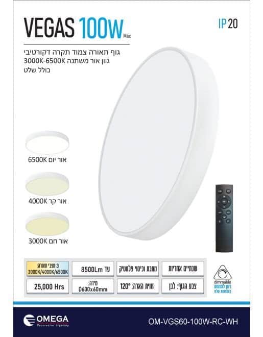 גוף תאורה צמוד תקרה VEGAS. גובה הגוף 60 מ"מ ומגיע במגוון גדלים, הספקים וצבעים. כולל שלט עם פונקציית CCT לבחירת גוון אור רצוי מ- 3000K ועד 6500K, כולל דימר באמצעות השלט לקביעת עוצמת האור הרצויה OMEGA