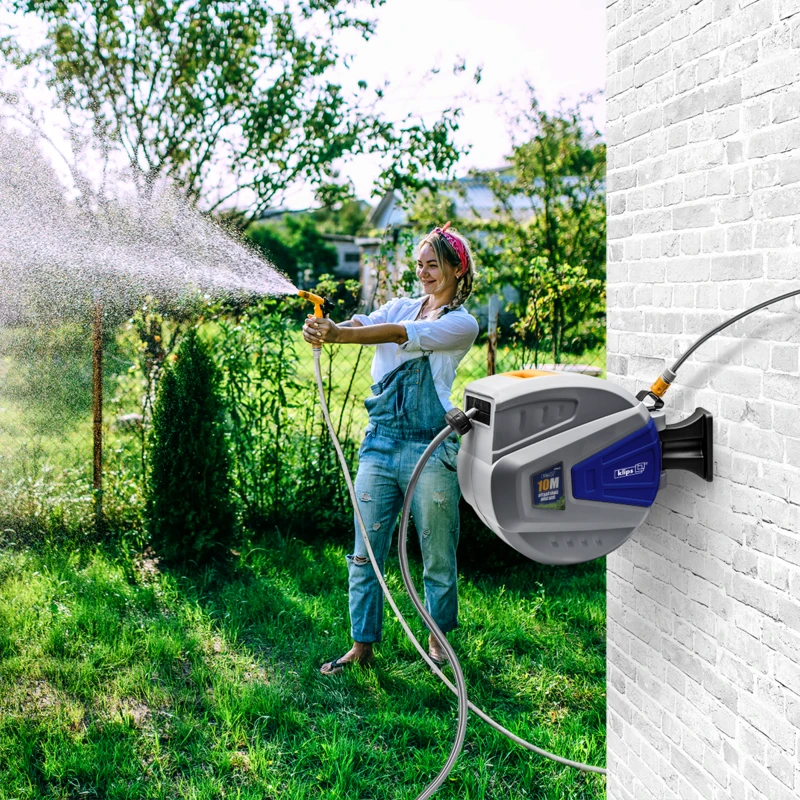 סליל צינור הגינה ניתן להרכבה על הקיר עם התושבת המסופקת ויכול להסתובב ב-180°ֽ אופקית כדי לענות על צורכי השקיה בכיוונים שונים.