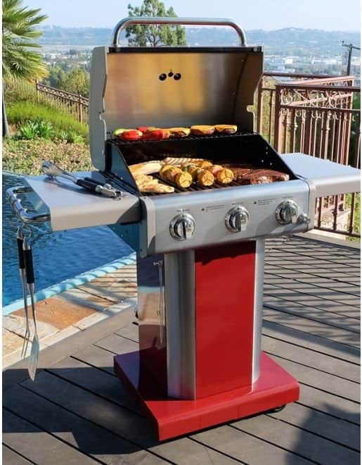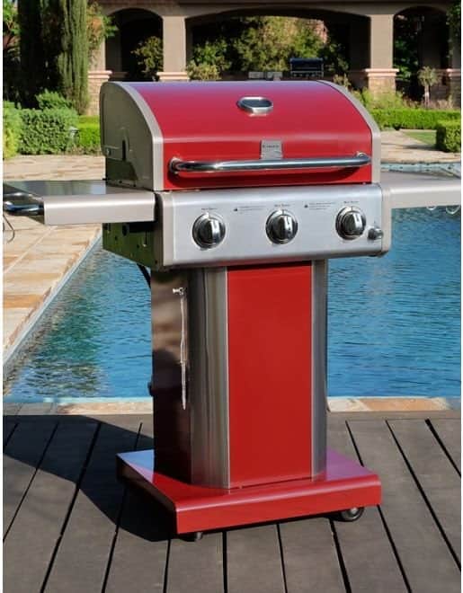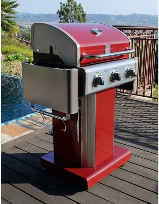 גריל גז קנמור,מדפים מתקפלים 3 מבערי נירוסטה,30K-BTU רשת צלייה מצופה אמייל,הצתה לכל מבער, תיבת צלייה דופן כפולה, צבע אדום רוחב הגריל עם מדפים סגורים הוא: 80 ס"מ