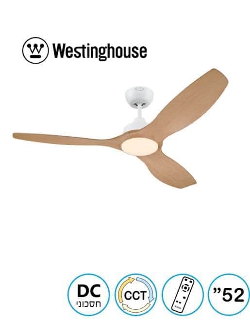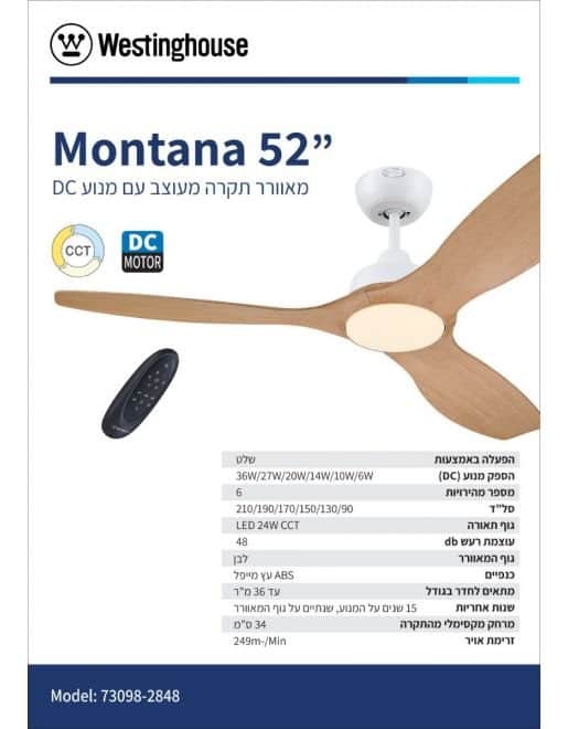מאוורר תקרה של המותג האמריקאי המוביל בעולם ווסטינגהאוס. מאוורר מסדרת Montana בגודל 52" עם 3 כנפיים העשויות מחומר מיוחד ABS, מנוע בצבע לבן מט וכנפיים בצבע עץ מייפל, הפעלת המאוורר מתבצעת באמצעות שלט. פעולת המאוורר שקטה במיוחד וצריכת החשמל נמוכה הודות למנוע מסוג DC עם 6 מהירויות כשהמהירות המקסימלית הינה 210 סיבובי מנוע לדקה והספק מנוע מקסימלי של 36 וואט שמזרים אוויר בעוצמה רבה של 249 קוב אוויר בדקה. המאוורר מתאים לחדרים בגודל עד 36 מ"ר והוא מיועד לשימוש פנימי בלבד. סוג התאורה במאוורר הינו LED CCT 24W 3000/4000/6500K. תקופת האחריות הינה 15 שנים למנוע מתוכן שנתיים לשאר חלקי המאוורר