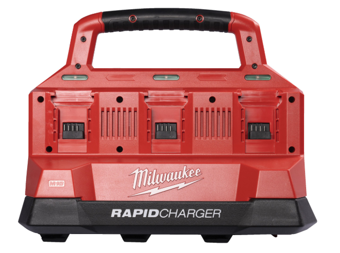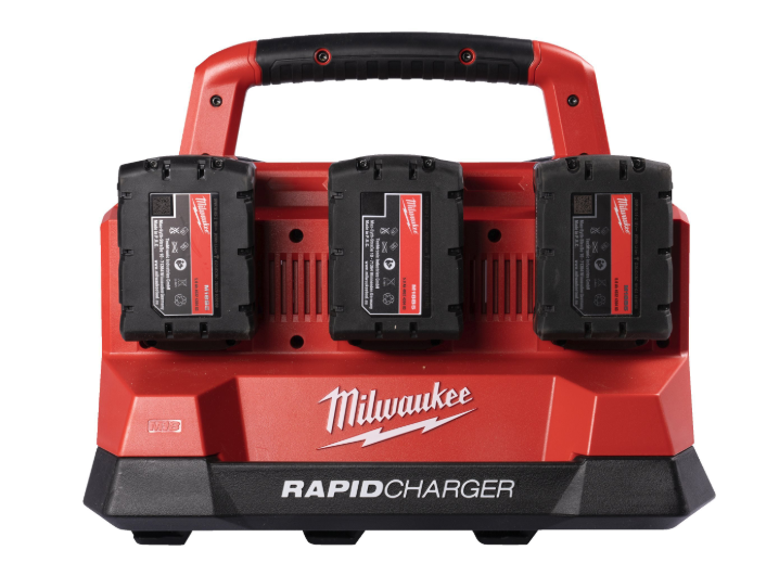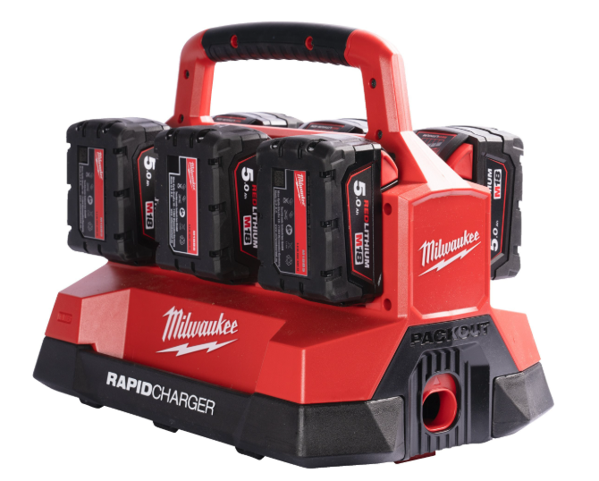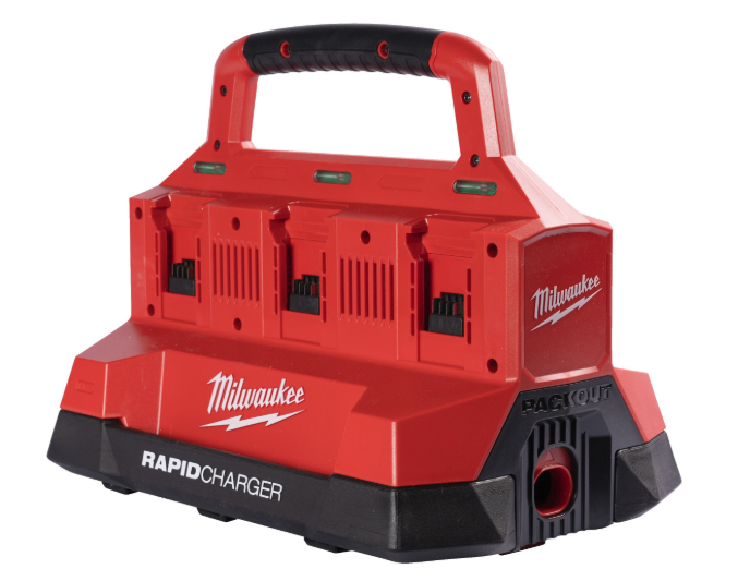 מטען M18 PACKOUT של Milwaukee מטעין עד 6 סוללות בו‑זמנית.