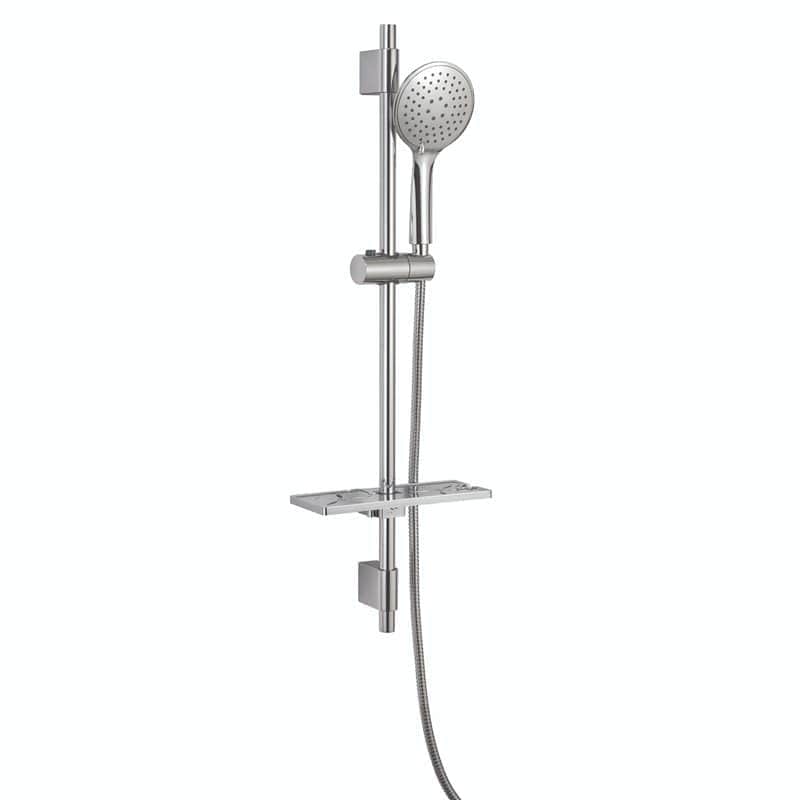 מערכת תליה למקלחת הכוללת: מוט נירוסטה באורך 80 ס"מ, צינור אמבטיה דופן כפולה באורך 1.50 מ', מקלח יד בעל 3 מצבי זרימה, סבונית מדף גדולה במיוחד להנחת בקבוקי שמפו, ומתלים מתכווננים לחורים הקיימים בקיר