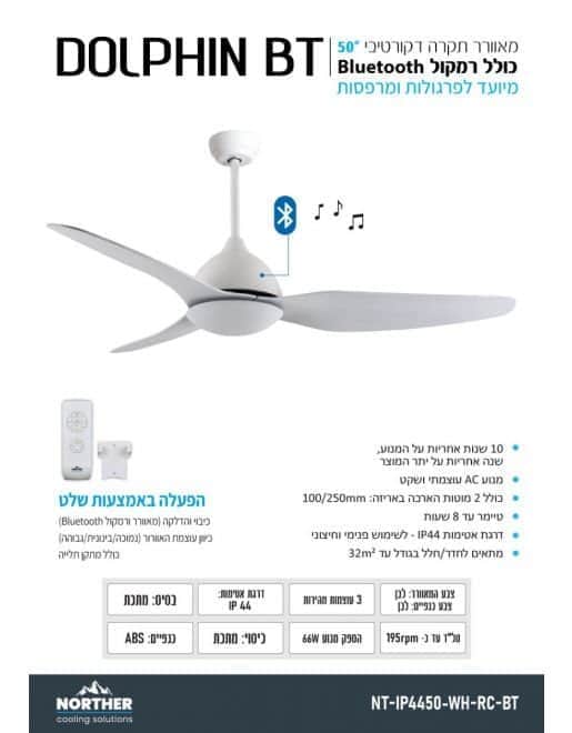 מאוורר תקרה מעוצב 50" דגם דולפין כולל רמקול מובנה מבית NORTHER, מוגן מים IP44 אידיאלי לפרגולות, הפעלה באמצעות שלט : כיבוי והדלקה, כיוון דרגת האוורור (נמוך/ביינוני/גבוהה), כולל רמקול חיבור bluetooth, כולל מתקן תלייה, גוף וכנפי המאוורר בצבע לבן, מנוע שקט במיוחד עם תקן CB.
