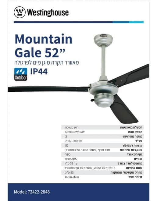 מאוורר תקרה Mountain Gale של מותג המאווררים האמריקאי Westinghouse בצבע כסף ובגודל 52" עם 3 כנפיים בצבע שחור ABS המסתובבים במהירות מקסימלית של 230 סיבובים לדקה. הפעלת המאוורר נעשית באמצעות חוט משיכה .דגם זה מתאים לחללים בגודל של עד 36 מ"ר ולשימוש חיצוני (מקורה כגון פרגולה או מרפסות) פעולת מאווררי ווסטינגהאוס שקטה במיוחד הודות לשימוש במנוע סיליקון מתקדם אך עוצמתי שמגיע למהירות סיבובי מנוע של 230 סלד עם 3 מהירויות, תקופת האחריות היא לשנתיים ואילו למנוע תקופת האחריות מורחבת ל-15 שנה