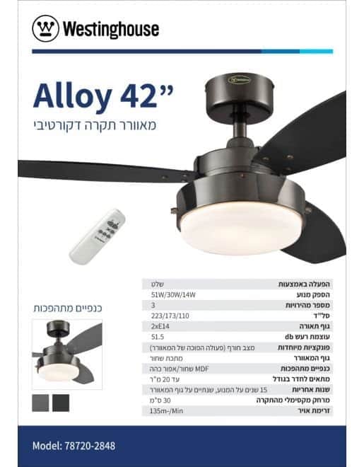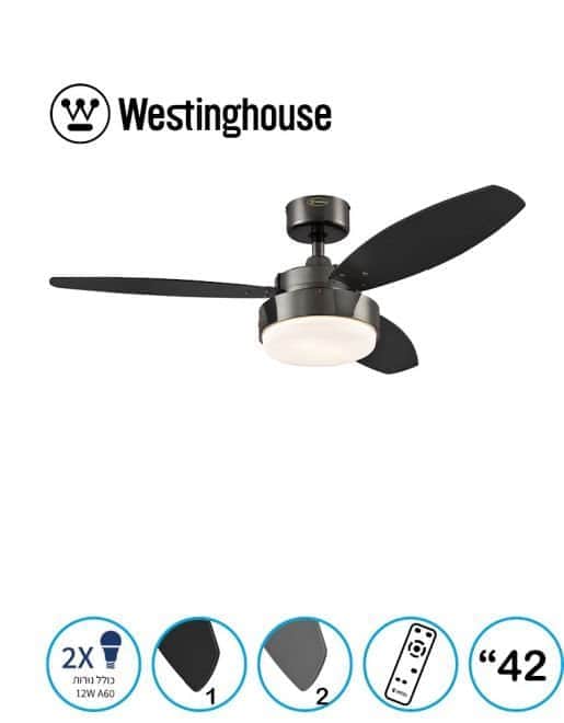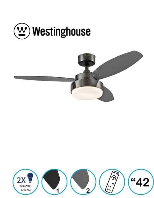 מאוורר תקרה Alloy של מותג המאווררים האמריקאי Westinghouse בצבע שחור ובגודל 42" עם 3 כנפיים מתהפכות בצבע שחור/אפור כהה MDF עם אפשרות לבחור בעצמכם את צבע הכנף. המסתובבים במהירות מקסימלית של 223 סיבובים לדקה. הפעלת המאוורר נעשית באמצעות שלט .דגם זה מתאים לחללים בגודל של עד 20 מ"ר ולשימוש פנימי פעולת מאווררי ווסטינגהאוס שקטה במיוחד הודות לשימוש במנוע סיליקון מתקדם אך עוצמתי שמגיע למהירות סיבובי מנוע של 223 סלד עם 3 מהירויות, תקופת האחריות היא לשנתיים ואילו למנוע תקופת האחריות מורחבת ל-15 שנה
