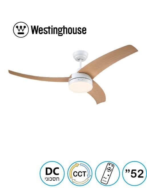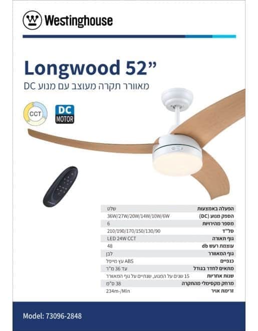 מאוורר תקרה של המותג האמריקאי המוביל בעולם ווסטינגהאוס. מאוורר מסדרת Longwood בגודל 52" עם 3 כנפיים העשויות מחומר מיוחד ABS, מנוע בצבע לבן מט וכנפיים בצבע מייפל, הפעלת המאוורר מתבצעת באמצעות שלט. פעולת המאוורר שקטה במיוחד וצריכת החשמל נמוכה הודות למנוע מסוג DC עם 6 מהירויות כשהמהירות המקסימלית הינה 210 סיבובי מנוע לדקה והספק מנוע מקסימלי של 36 וואט שמזרים אוויר בעוצמה רבה של 234 קוב אוויר בדקה. המאוורר מתאים לחדרים בגודל עד 36 מ"ר והוא מיועד לשימוש פנימי בלבד. סוג התאורה במאוורר הינו LED CCT 24W 3000/4000/6500K. תקופת האחריות הינה 15 שנים למנוע מתוכן שנתיים לשאר חלקי המאוורר
