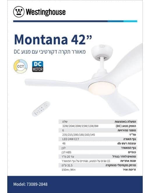 מאוורר תקרה 42" מסדרת Montana צבע גוף לבן מט צבע כנפיים לבן, מנוע DC, שלט,24W LED(3000/4000/6500K) מתאים לשימוש פנימי