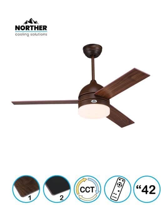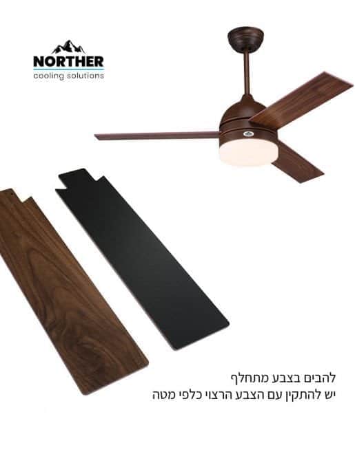 מותג NORTHER קוטר כנפיים 42 אינץ' (105 ס"מ) צבע הגוף לבחירה קפה הפעלה באמצעות שלט מקור האור LED Kelvin 3000K/4000K/6500K גודל החלל מתאים לחדר/חלל בגודל עד 15m² הספק מנוע 60W גודל מנוע AC 153x15mm סל"ד 260rpm זרימת אויר 148m³/Min דרגת אטימות IP20 מצב חורף לא כולל גובה מוט התקנה 100/250mm אחריות על המנוע 10 שנים אחריות על הגוף שנה מסירות אור CRI CRI80 גוון אור גוון אור משתנה לומן 1700 מבנה גוף מתכת+ plywood הספק תאורה 20W עם/בלי תאורה כולל גוף תאורה מתח כניסה 220-240V