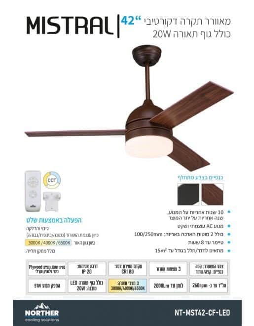 מאוורר תקרה מעוצב 42" דגם MISTRAL כולל גוף תאורה LED גוון אור משתנה, הפעלה באמצעות שלט : כיבוי והדלקה, כיוון דרגת האוורור (נמוך/ביינוני/גבוהה), כיוון גוון האור בין 3000K/4000K/6500K, גוף המאוורר צבע עץ להבים בצבע מתחלף שחור/עץ ניתן להתקין את כנפי המאוורר עם הצבע הרצוי כלפי מטה, מנוע שקט במיוחד עם תקן CB.