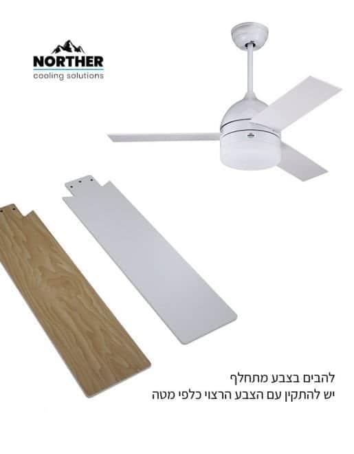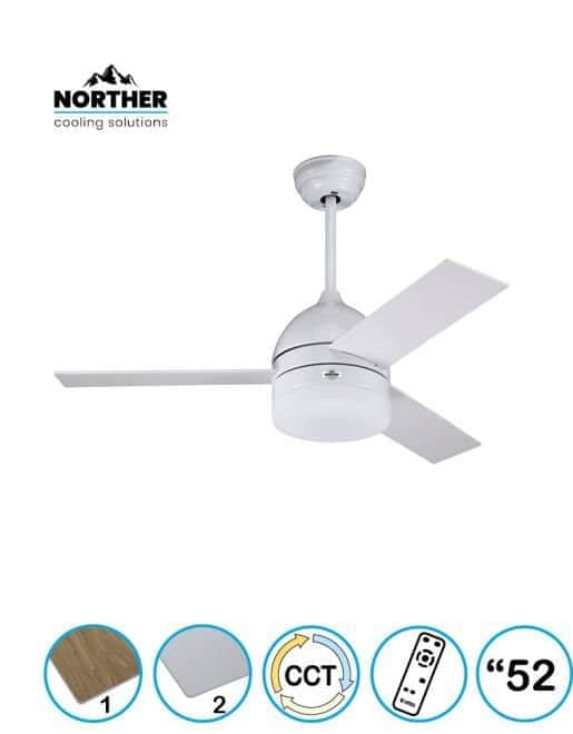 מותג NORTHER קוטר כנפיים 52 אינץ' (132 ס"מ) צבע הגוף לבחירה לבן מקור האור LED Kelvin 3000K/4000K/6500K הספק מנוע 60W גודל מנוע AC 153x15mm סל"ד 200 דרגת אטימות IP20 מצב חורף לא כולל גובה מוט התקנה 100/250mm אחריות על המנוע 10 שנים אחריות על הגוף שנה מסירות אור CRI CRI80 גוון אור גוון אור משתנה לומן 1700 מבנה גוף מתכת+ plywood הספק תאורה 20W עם/בלי תאורה כולל גוף תאורה מתח כניסה 220-240V