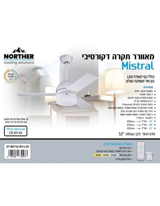 מאוורר תקרה מעוצב 52" דגם MISTRAL כולל גוף תאורה LED גוון אור משתנה, הפעלה באמצעות שלט : כיבוי והדלקה, כיוון דרגת האוורור (נמוך/ביינוני/גבוהה), כיוון גוון האור בין 3000K/4000K/6500K, גוף המאוורר לבן להבים בצבע מתחלף לבן/עץ ניתן להתקין את כנפי המאוורר עם הצבע הרצוי כלפי מטה, מנוע שקט במיוחד עם תקן CB.