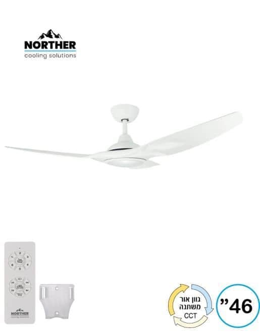 מאוורר תקרה דקורטיבי 46 כולל גוף תאורה 24W עם פלטת LED בגוון אור משתנה באמצעות שלט, מנוע DC מתקדם, עוצמתי ושקט, הספק מנוע 35W מהירות סיבוב 260 סיבובים לדקה, אפשרות כיבוי והפעלה שליטה במהירות הסיבובים ובגוון האור עי" שלט ייעודי. צבע המאוורר והכנפיים לבן NORTHER PREMIUM