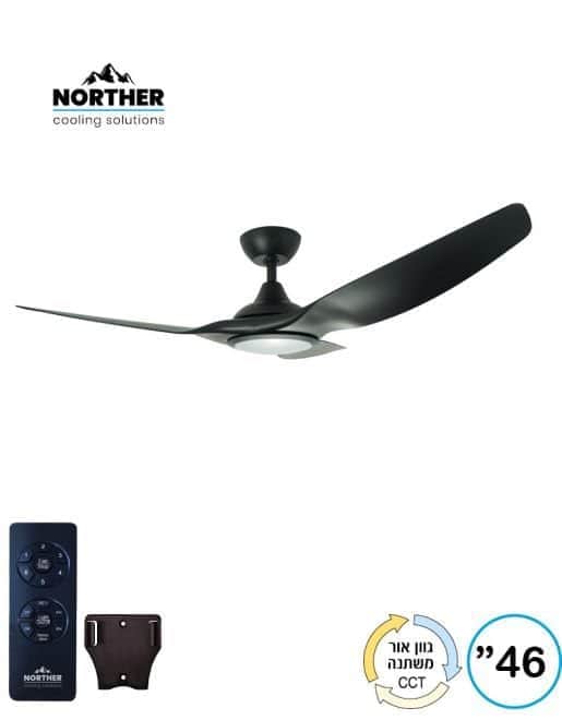 מאוורר תקרה דקורטיבי 46 כולל גוף תאורה 24W עם פלטת LED בגוון אור משתנה באמצעות שלט, מנוע DC מתקדם, עוצמתי ושקט, הספק מנוע 35W מהירות סיבוב 260 סיבובים לדקה, אפשרות כיבוי והפעלה שליטה במהירות הסיבובים ובגוון האור עי" שלט ייעודי. צבע המאוורר והכנפיים שחור NORTHER PREMIUM