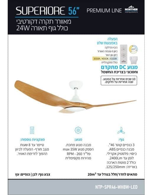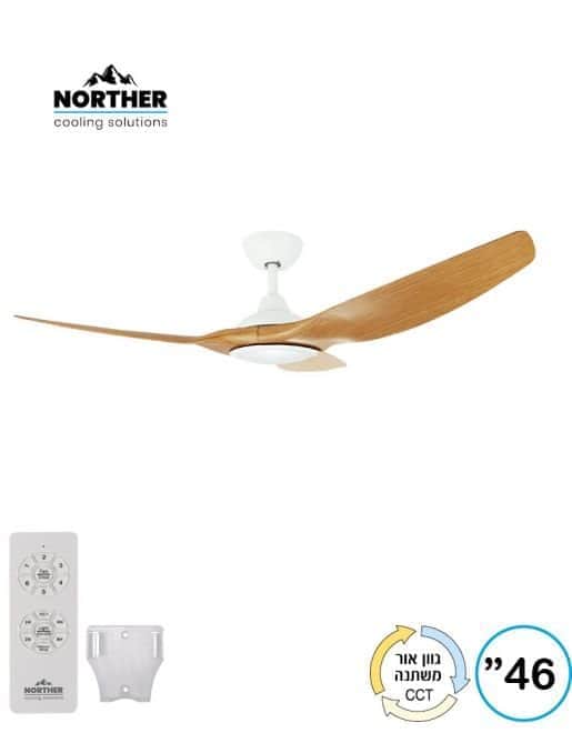 מאוורר תקרה דקורטיבי 46 כולל גוף תאורה 24W עם פלטת LED בגוון אור משתנה באמצעות שלט, מנוע DC מתקדם, עוצמתי ושקט, הספק מנוע 35W מהירות סיבוב 260 סיבובים לדקה, אפשרות כיבוי והפעלה שליטה במהירות הסיבובים ובגוון האור עי" שלט ייעודי. צבע המאוורר לבן עם כנפיים בצבע עץ NORTHER PREMIUM