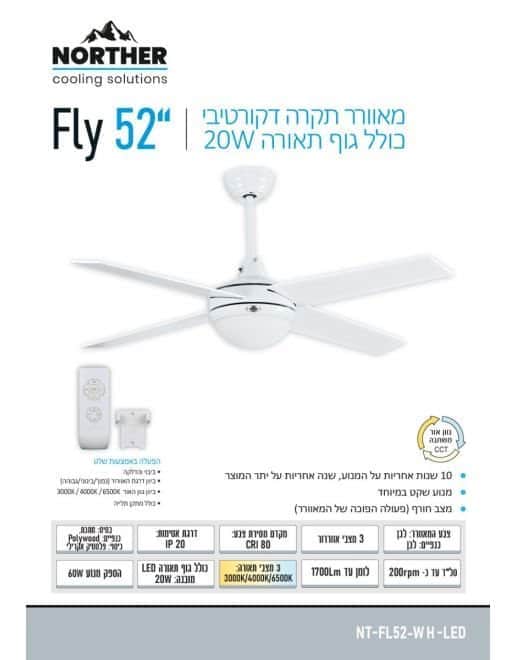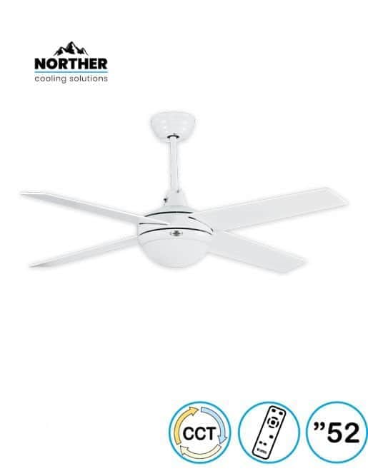 מותג NORTHER קוטר כנפיים 52 אינץ' (132 ס"מ) צבע הגוף לבחירה לבן צבע כנפיים לבן הפעלה באמצעות שלט גוף תאורה 20W CCT Kelvin 3000K/4000K/5000K מבנה להבים plywood סוג מנוע AC הספק מנוע 60W סל"ד 200 דרגת אטימות IP20 מצב חורף כולל אחריות על המנוע 10 שנים אחריות על הגוף שנה גוון אור גוון אור משתנה מבנה גוף מתכת עם/בלי תאורה כולל גוף תאורה