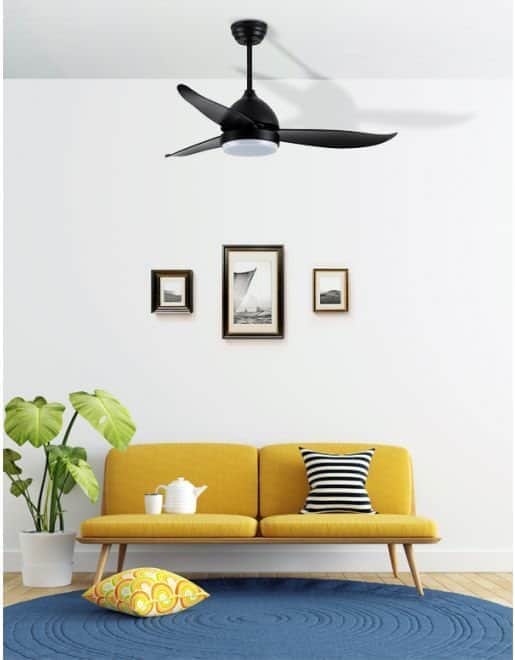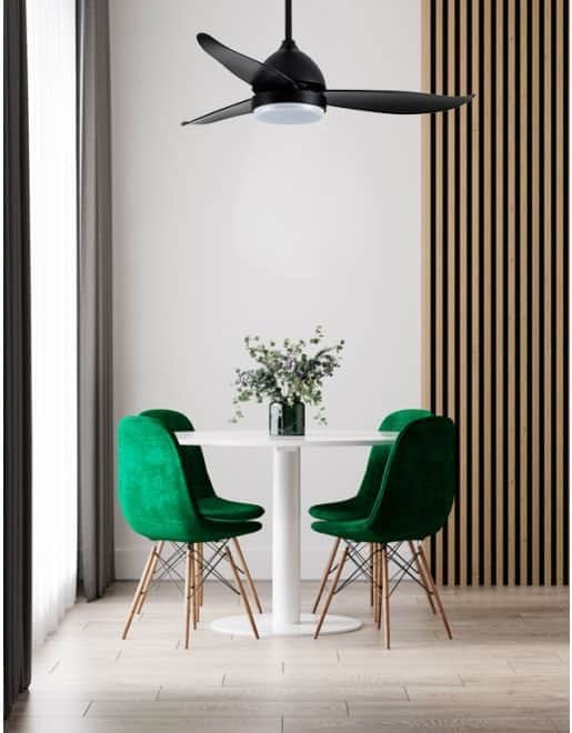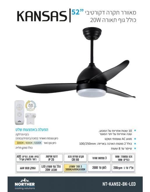 מאוורר תקרה מעוצב 52" דגם KANSAS כולל גוף תאורה LED גוון אור משתנה, הפעלה באמצעות שלט : כיבוי והדלקה, כיוון דרגת האוורור (נמוך/ביינוני/גבוהה), כיוון גוון האור בין 3000K/4000K/6500K, גוף המאוורר והכנפיים בצבע שחור, מנוע שקט במיוחד עם תקן CB.