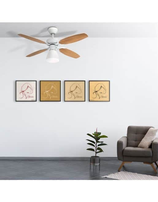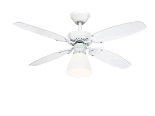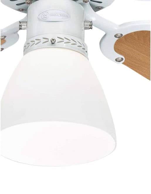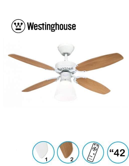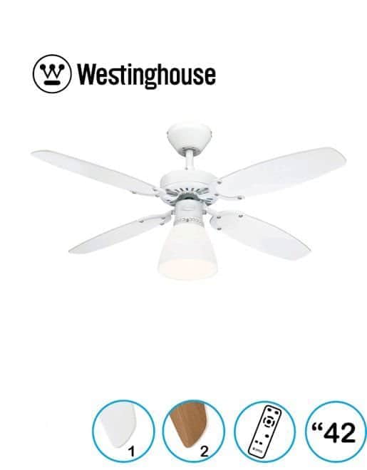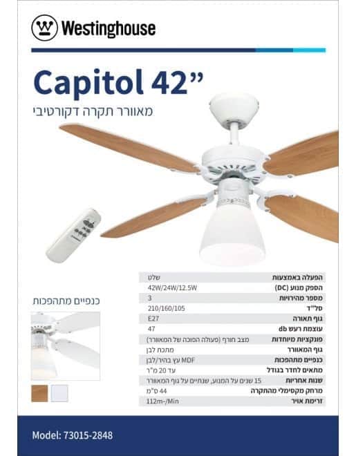 מאוורר תקרה מסדרת Capitol בגודל 42" של מותג המאווררים האמריקאי המוביל בעולם ווסטינגהאוס. גוף המנוע בצבע לבן והכנפיים מתהפכות בצבע לבן/עץ בהיר MDF עם אפשרות לבחור בעצמכם את צבע הכנף. הפעלת המאוורר נעשית באמצעות שלט והוא מושלם לחדרים. בגודל עד 20 מ"ר. מאווררי ווסטינגהאוס שקטים מאוד עד כדי כך שלא תשמעו אותם גם בלילות השקטים ביותר הודות למנוע סיליקון שקט במיוחד עם מהירות סבובי מנוע מרשימה של 210 סל"ד. תקופת האחריות למאוורר הינה 15 שנה למנוע ושנתיים מלאות לשאר חלקי המאוורר. גובה מקסימלי מהתקרה לאחר תליית המאוורר הינו 44 ס"מ