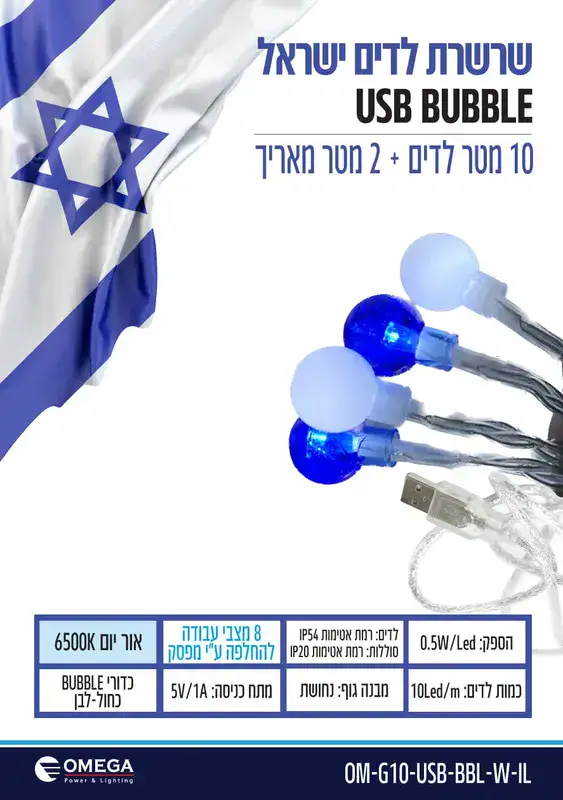 מהדורה מיוחדת ליום העצמאות מותגOMEGAהערותכולל 10 נורות בהספק של 15W כחול לבןצבע הגוף לבחירהשחורהברגהE27 בסיסדרגת אטימותIP44אחריותשנהכמות באריזה פנימית-1