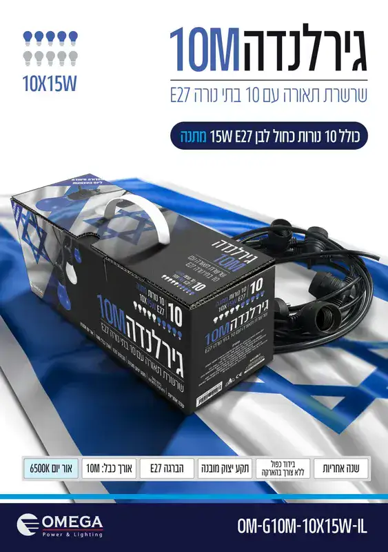 שרשרת תאורה – גרלנדה באורך 10 מטר, 10 בתי נורות בהברגה E27 כולל נורות לד 15 וואט בגוון כחול ולבן. תקע יצוק מובנה, בידוד כפול וללא צורך בהארקה. מתאים לנורות לד בלבד עד 15 וואט. המוצר מגיע באריזת קיט מהודרת OMEGA