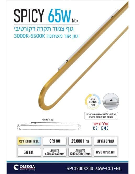 הספק 65W מותג OMEGA גוון אור משולב צבע הגוף לבחירה זהב מידות הגוף 1200x200x11mm מתח כניסה 90-256V צורה אליפסה דרגת אטימות IP20 מסירות אור CRI CRI 80 שעות עבודה 25000 אחריות שנתיים אחריות