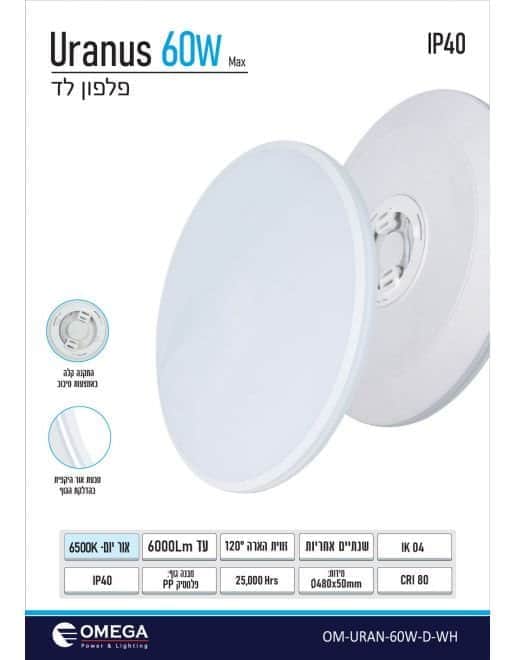 הספק 60W מותג OMEGA גוון אור אור יום Kelvin 6500K לומן 6000 צבע הגוף לבחירה לבן מידות הגוף ø480x50mm מתח כניסה AC 100 240V צורה עגול דרגת אטימות IP40 מסירות אור CRI CRI 80 זווית הארה 120° שעות עבודה 25000 אחריות שנתיים כמות באריזה פנימית- 1 כמות באריזה חיצונית- 10