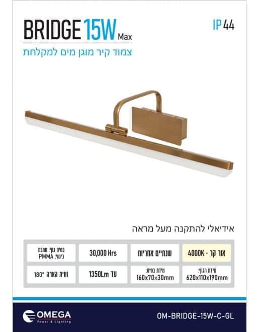הספק 15W מותג OMEGA גוון אור אור קר Kelvin 4000K לומן 1350 מבנה גוף מתכת + PMMA צבע הגוף לבחירה זהב מוברש מידות הגוף 620x110x190 mm מתח כניסה 220-240V דרגת אטימות IP44 מסירות אור CRI Ra>80 זווית הארה 180° שעות עבודה 30000 אחריות שנתיים אחריות