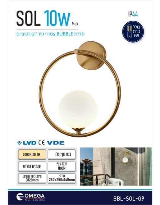 הערות סדרת BUBBLE צמוד קיר דקורטיבי, כולל נורה G9 מותג OMEGA גוון אור אור חם Kelvin 3000K מבנה גוף IRON צבע הגוף לבחירה פליז מידות הגוף 280x250x140mm כיסוי כיסויי זכוכית Ø120 סוג נורה G9 דרגת אטימות IP20 אחריות שנתיים