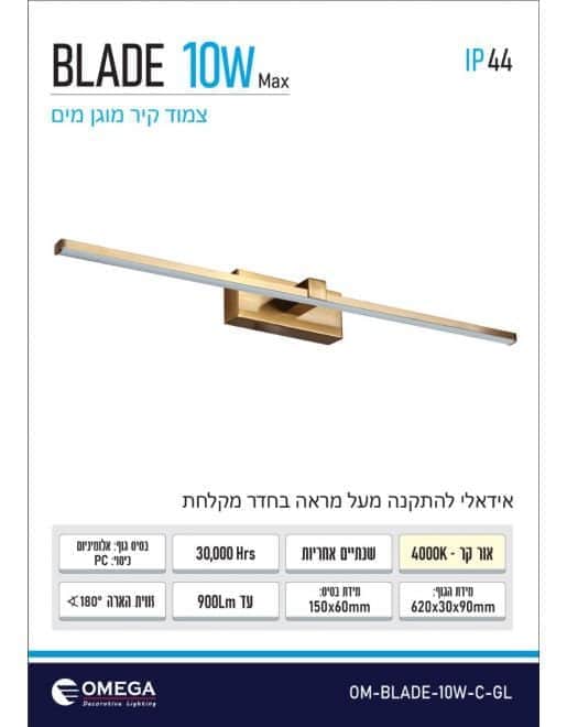 הספק 10 מותג OMEGA גוון אור אור קר Kelvin 4000K לומן 900 מבנה גוף אלומיניום + פוליקרבונט צבע הגוף לבחירה זהב מוברש מידות הגוף 620x30x90 מתח כניסה 220 240V דרגת אטימות IP44 מסירות אור CRI CRI 80 זווית הארה 180 שעות עבודה 30000 אחריות שנתיים אחריות