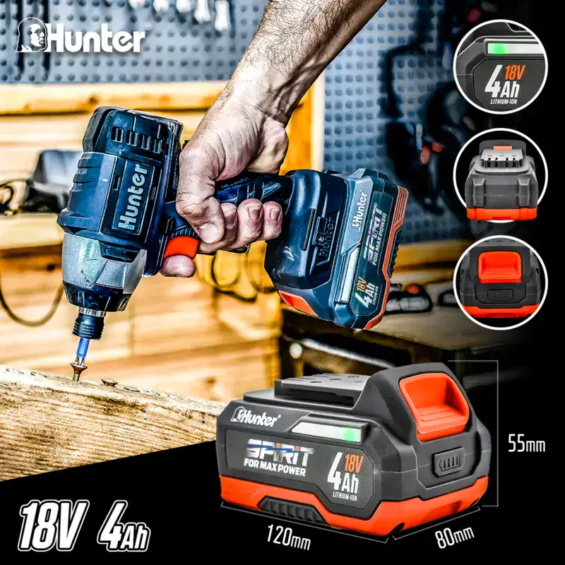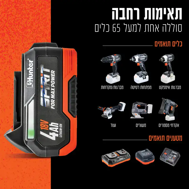 הכירו את סוללת הליתיום-יון העוצמתית מבית HUNTER, המשלבת קיבולת מוגדלת של 4.0Ah עם טכנולוגיה מתקדמת. עם עוצמה כפולה, תוכלו לעבוד זמן ארוך יותר, להספיק יותר, ולהתמקד במה שחשוב באמת – העבודה שלכם.