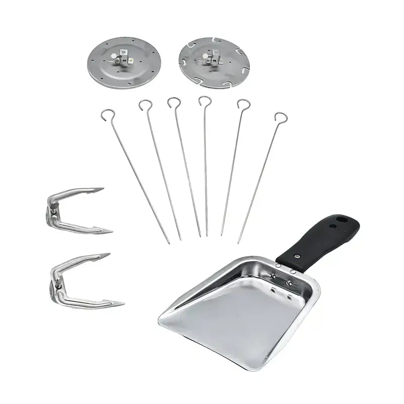 מגש איסוף נוזלים, זוג מגשי שיפודים, שיפוד רוטיסרי (מסתובב), 7 שיפודים אישיים, 2 מזלגות רוטיסרי, כף איסוף.